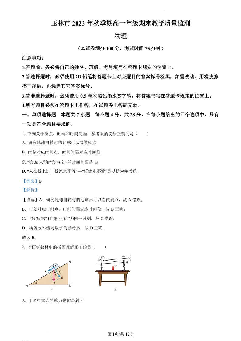 广西壮族自治区玉林市2023-2024学年高一上学期期末考试物理(精品解析版)