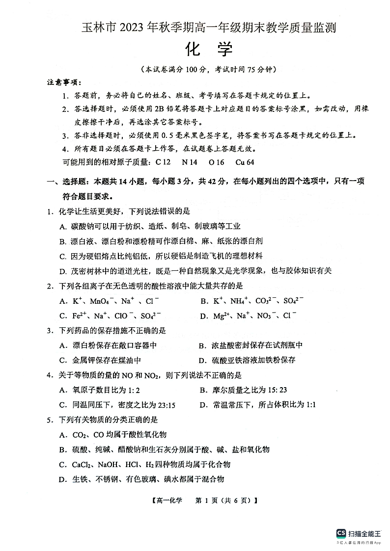广西壮族自治区玉林市2023-2024学年高一上学期期末考试化学