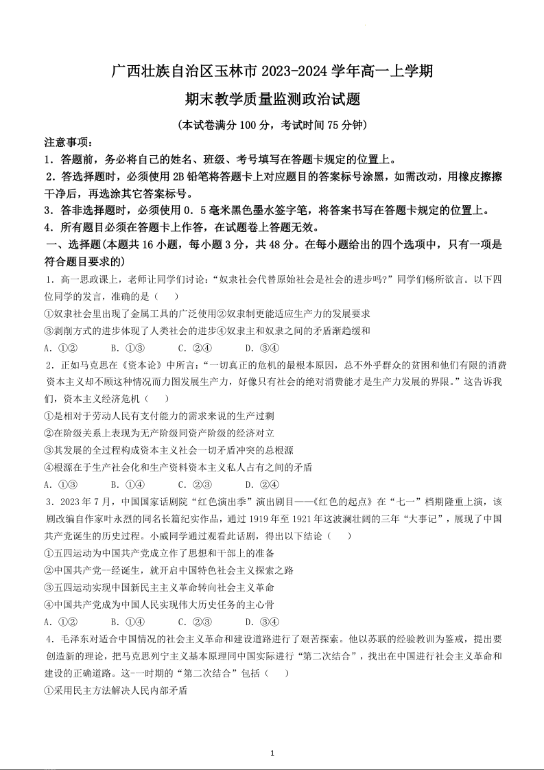 广西壮族自治区玉林市2023-2024学年高一上学期期末考试政治