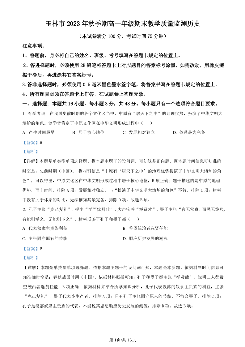广西壮族自治区玉林市2023-2024学年高一上学期期末考试历史(精品解析版)