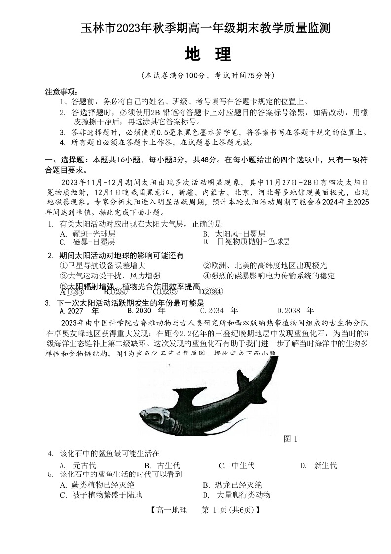 广西壮族自治区玉林市2023-2024学年高一上学期期末考试地理