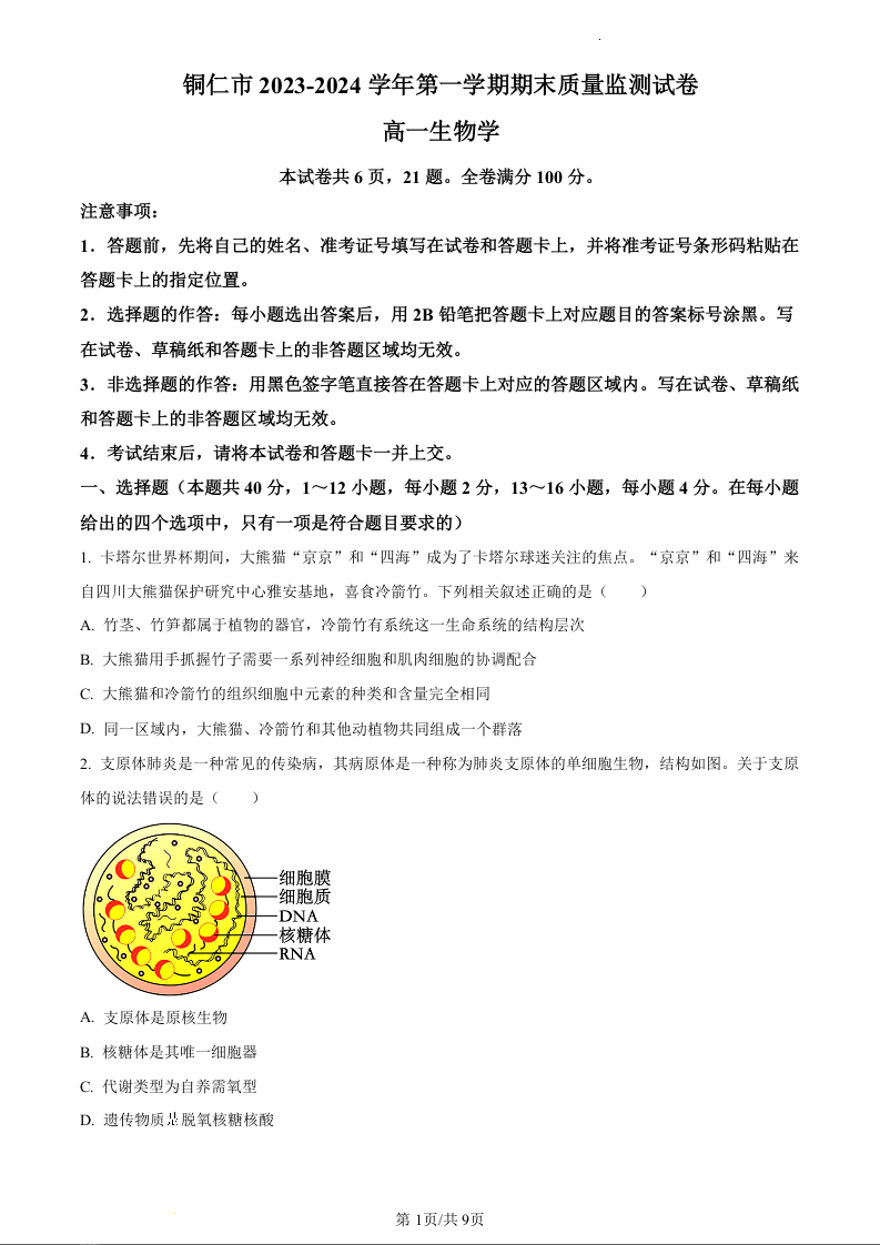 贵州省铜仁市2023-2024学年高一上学期期末考试生物(原卷版)