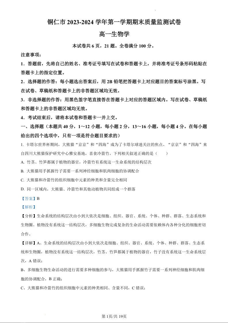贵州省铜仁市2023-2024学年高一上学期期末考试生物(精品解析版)