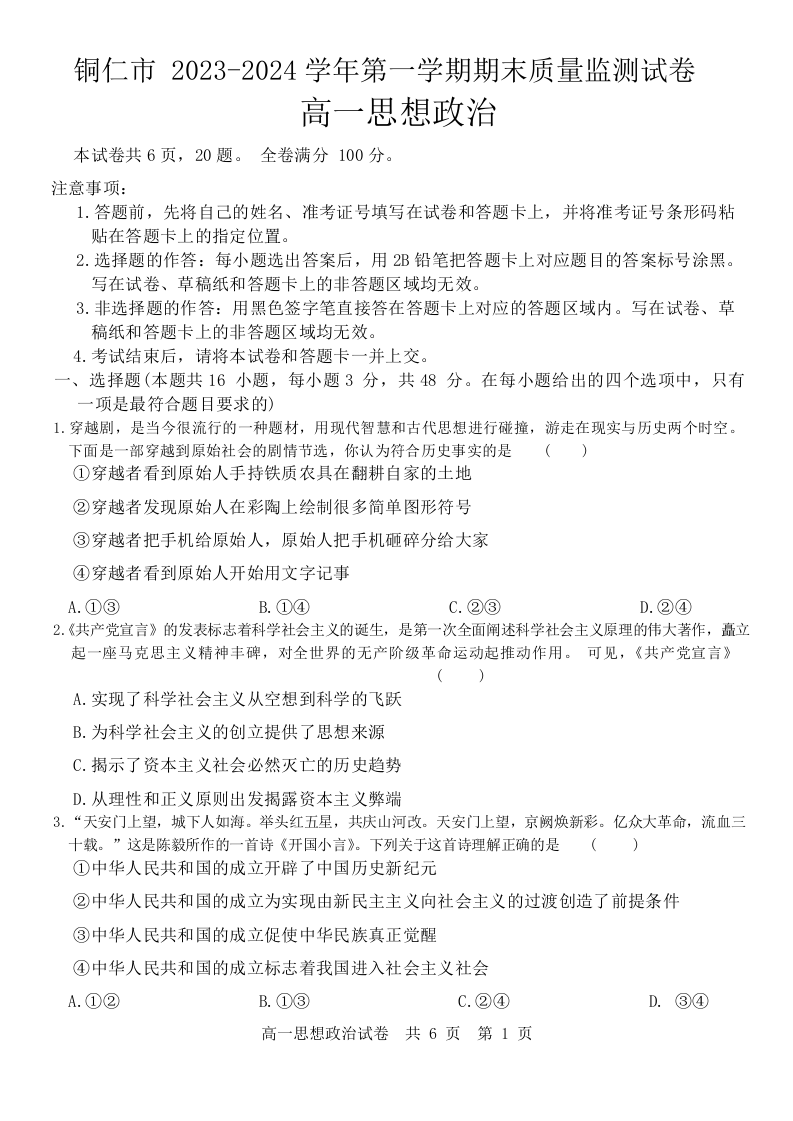 贵州省铜仁市2023-2024学年高一上学期期末考试政治