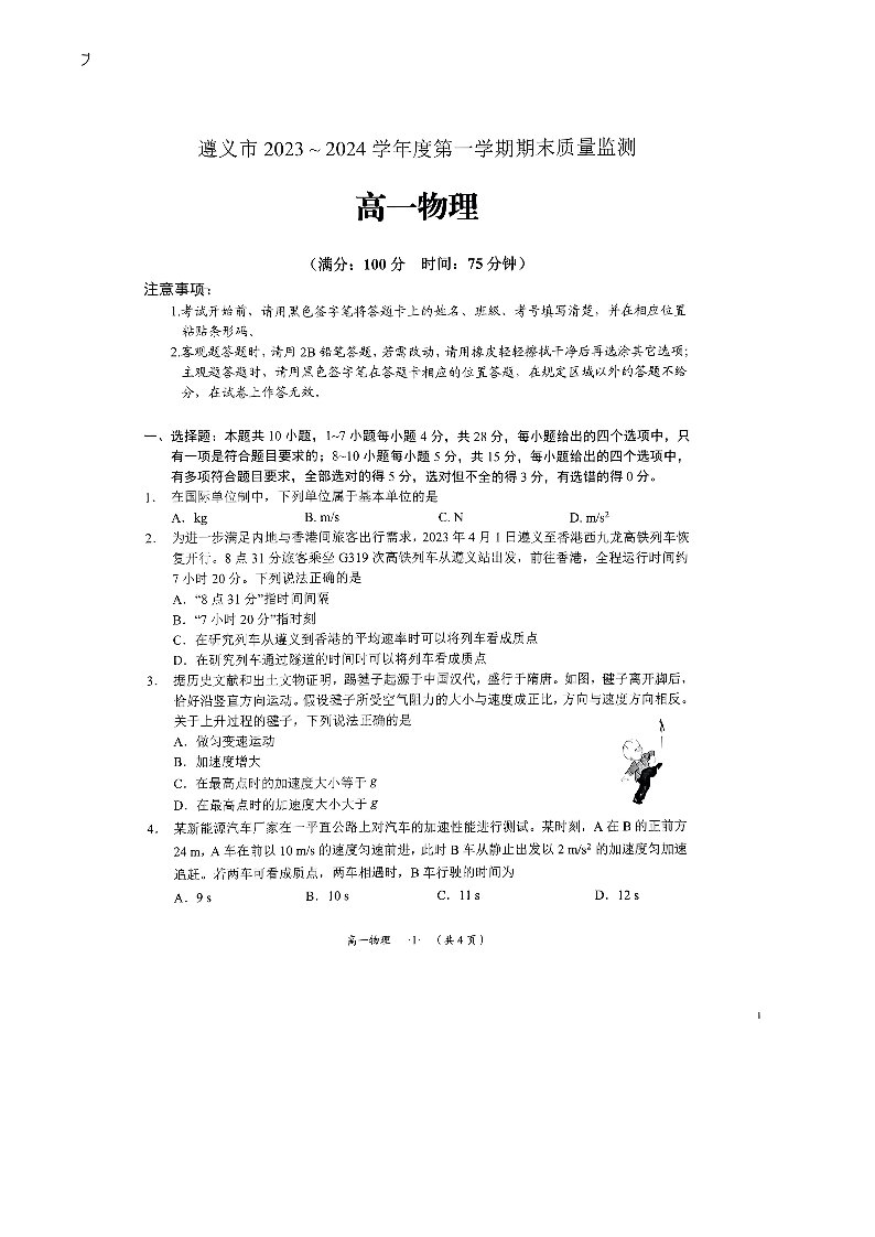 贵州省遵义市2023-2024学年高一上学期1月期末质量监测考试物理