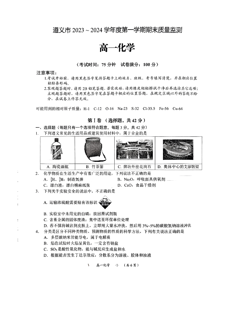 贵州省遵义市2023-2024学年高一上学期1月期末质量监测考试化学