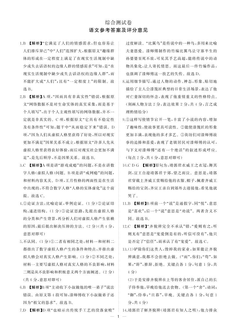 河北省衡水中学2023-2024学年高一上学期1月期末考试语文答案