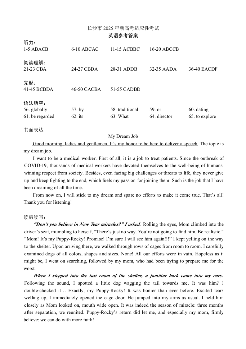 湖南省长沙市2024-2025学年上学期高三新高考适应性考试(一模)英语答案