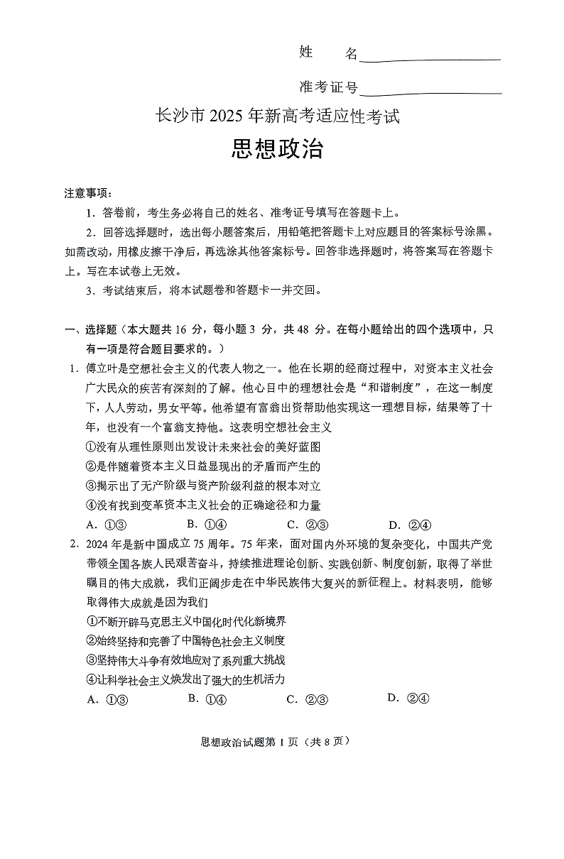 湖南省长沙市2024-2025学年上学期高三新高考适应性考试(一模)政治