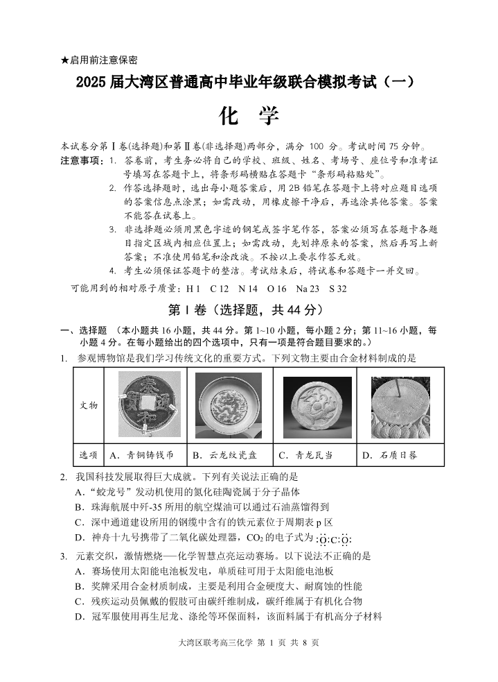 广东省大湾区普通高中2024-2025学年上学期毕业年级联合模拟化学+答案
