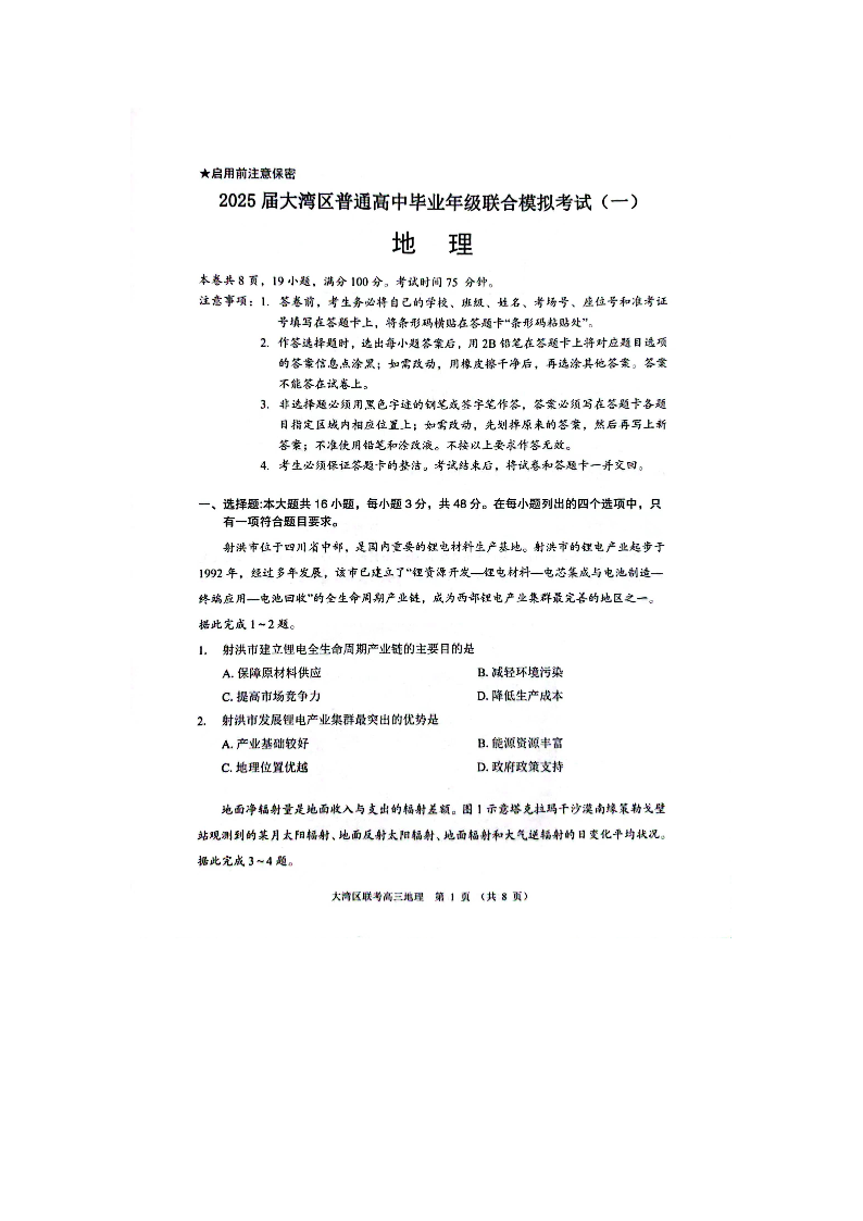 广东省大湾区普通高中2024-2025学年上学期毕业年级联合模拟地理+答案
