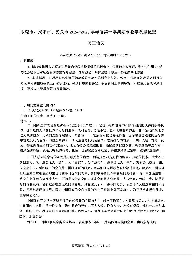 广东省东莞市、揭阳市、韶关市2024-2025学年上学期高三期末考试语文+答案