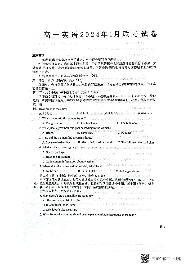 河北省保定市部分学校2023-2024学年高一上学期1月月考英语