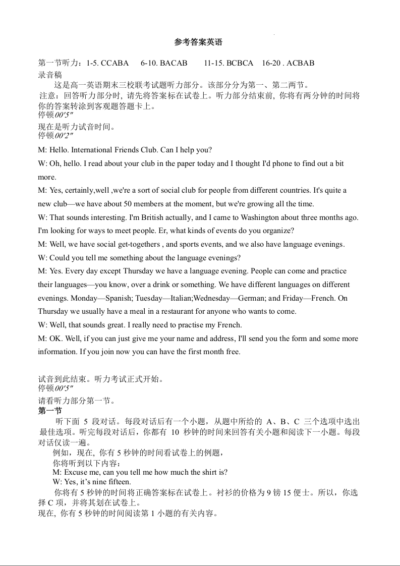 河北省保定市部分学校2023-2024学年高一上学期1月月考英语答案