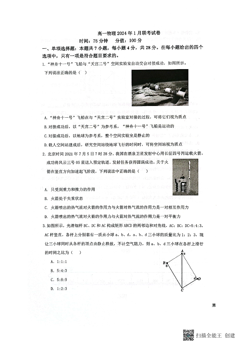 河北省保定市部分学校2023-2024学年高一上学期1月月考物理