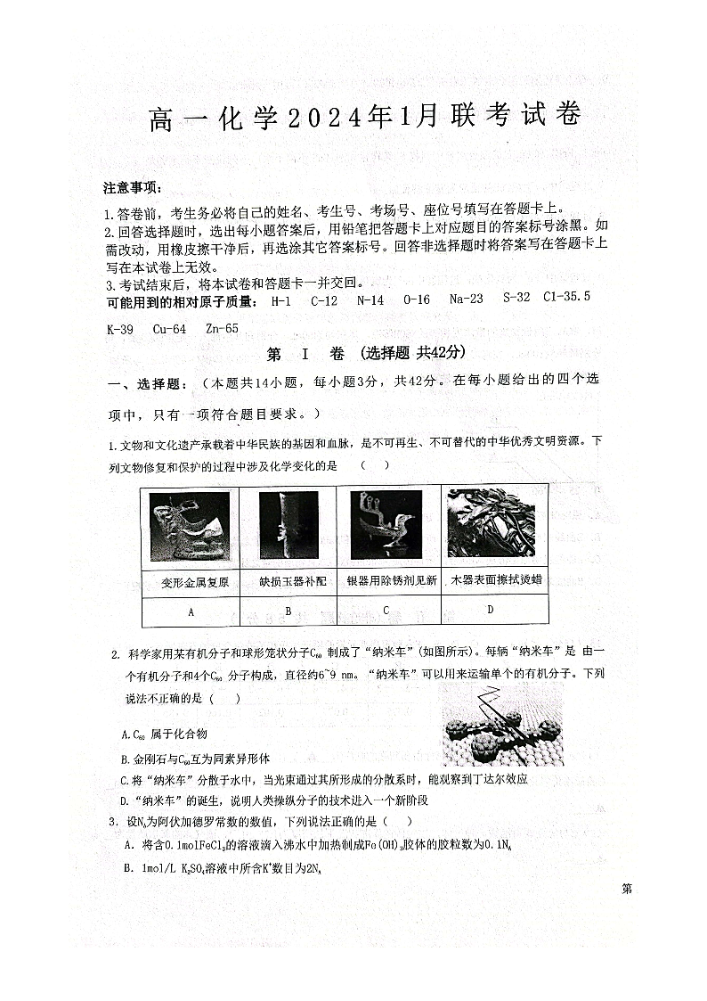 河北省保定市部分学校2023-2024学年高一上学期1月月考化学