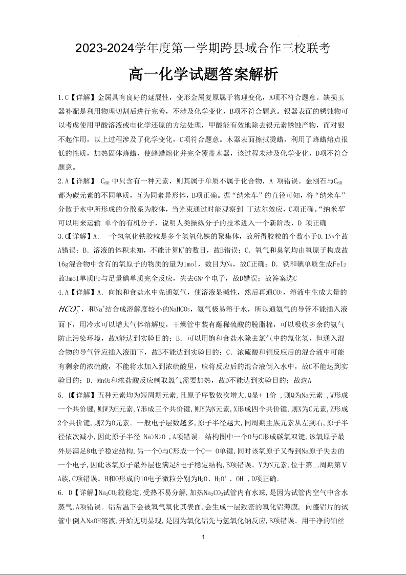 河北省保定市部分学校2023-2024学年高一上学期1月月考化学答案