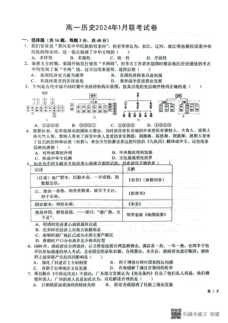 河北省保定市部分学校2023-2024学年高一上学期1月月考历史