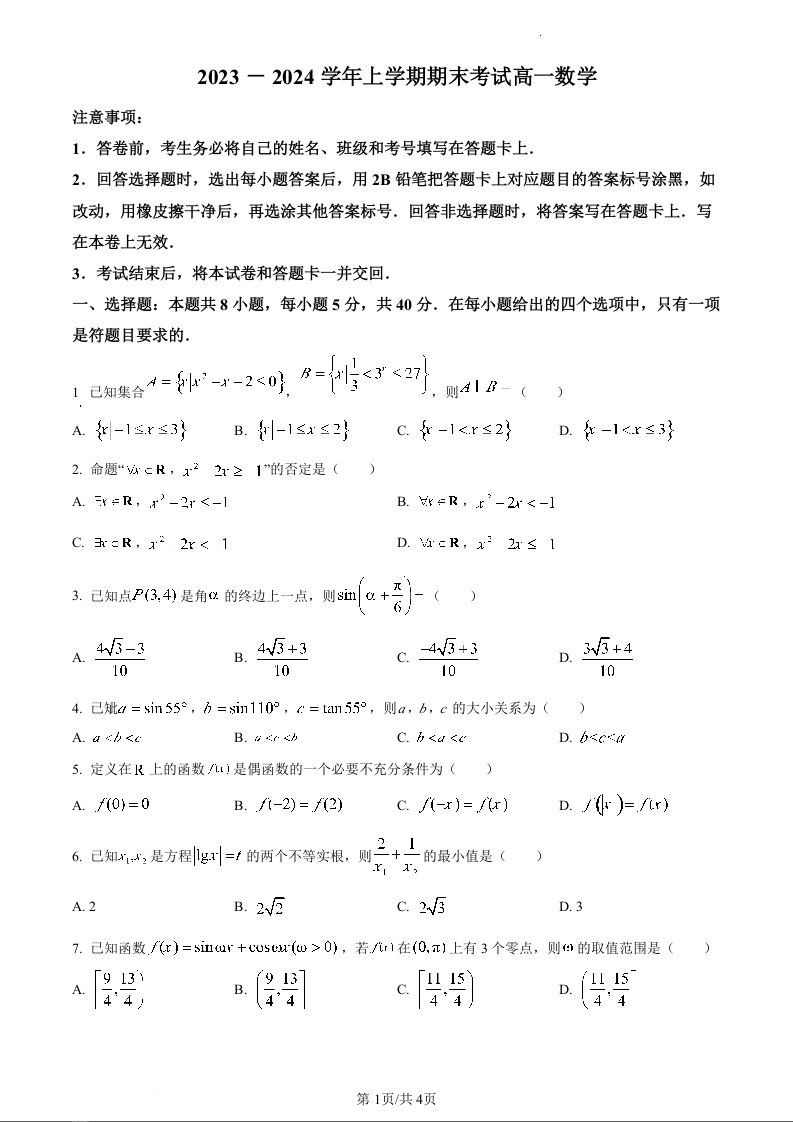 河北省沧州市泊头市第一中学2023-2024学年高一上学期1月月考数学(原卷版)