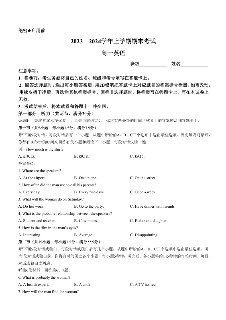 河北省沧州市泊头市第一中学2023-2024学年高一上学期1月月考英语