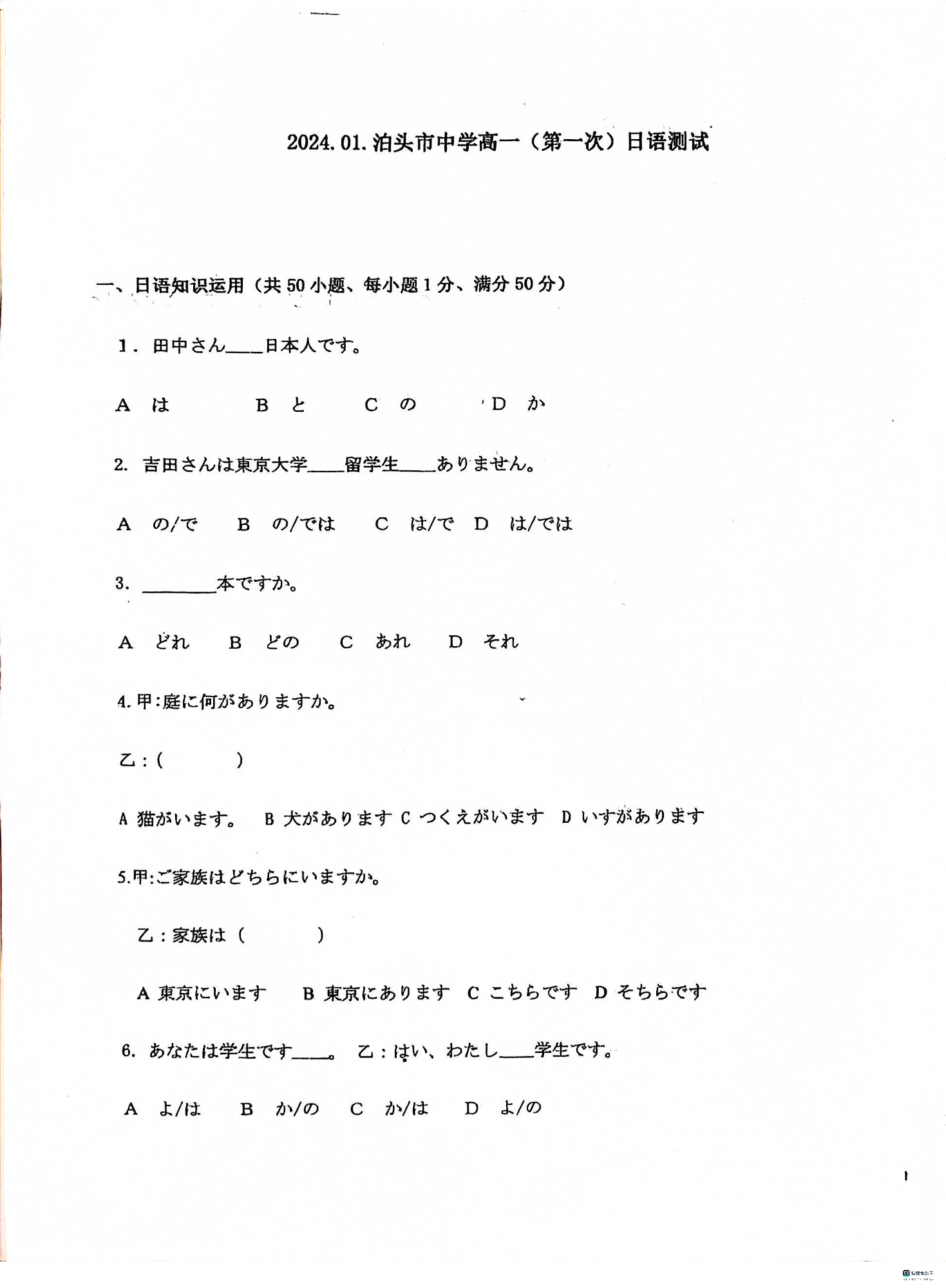 河北省沧州市泊头市第一中学2023-2024学年高一上学期1月月考日语