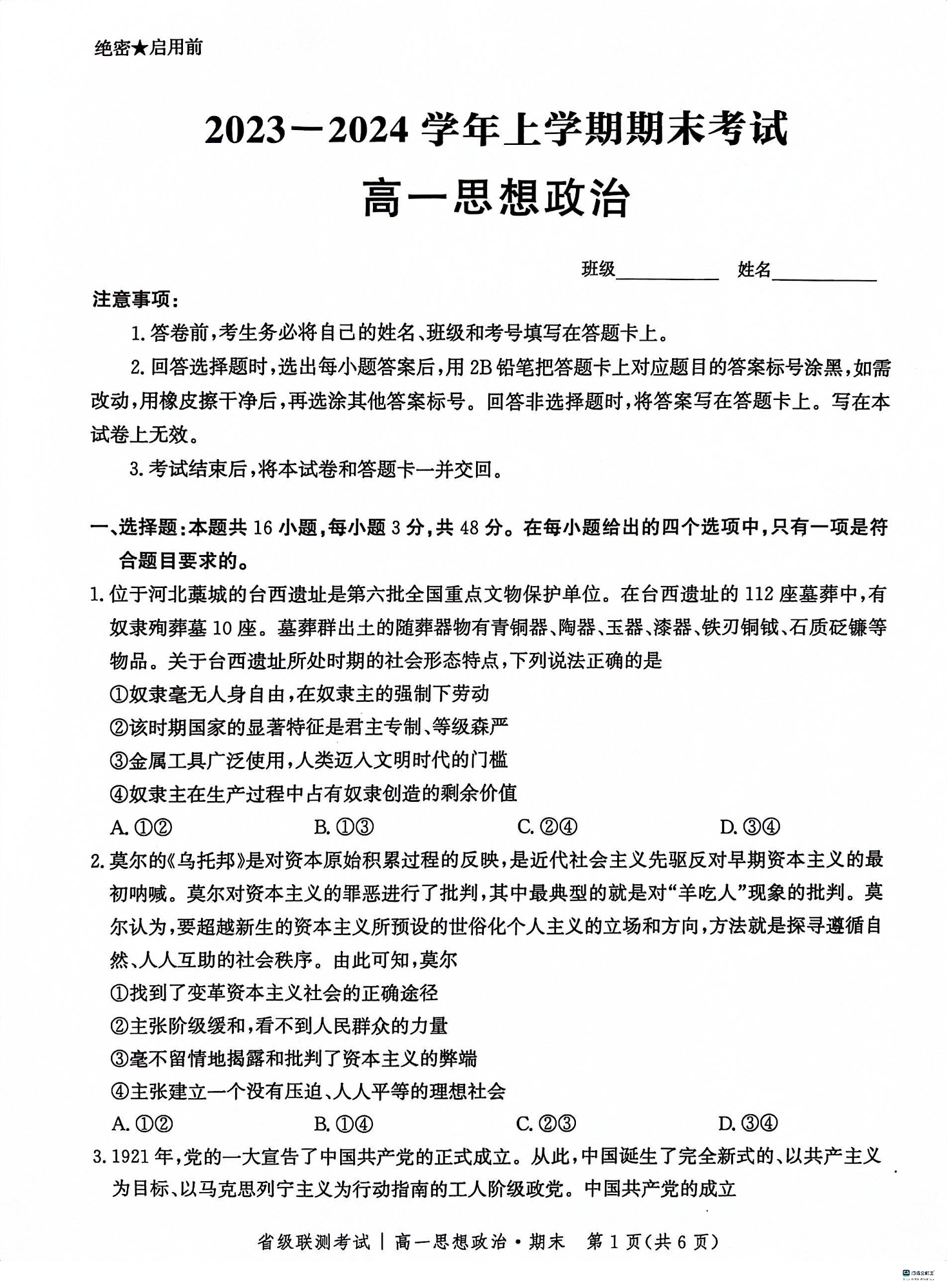 河北省沧州市泊头市第一中学2023-2024学年高一上学期期末考试政治+答案