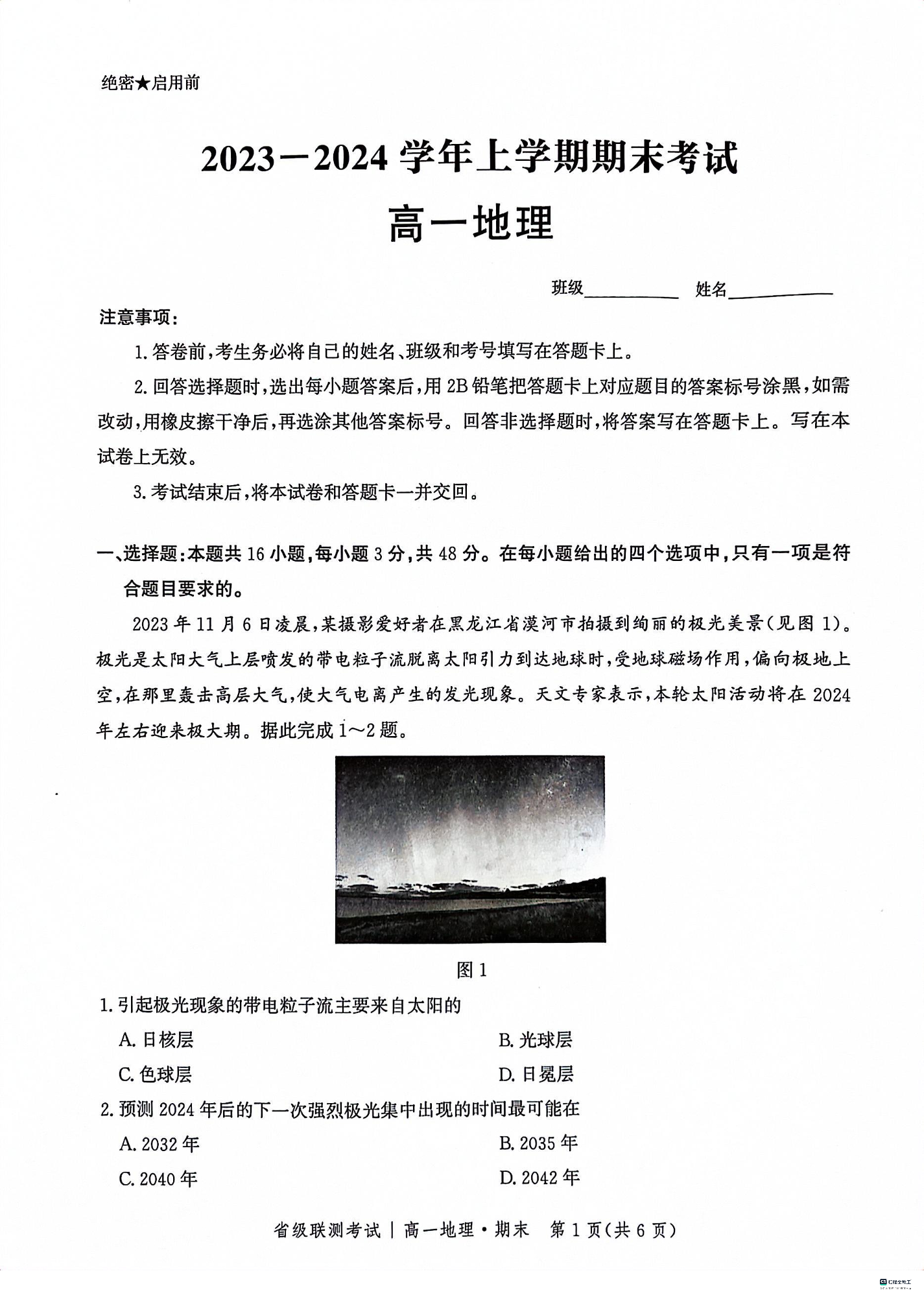 河北省沧州市泊头市第一中学2023-2024学年高一上学期期末地理+答案