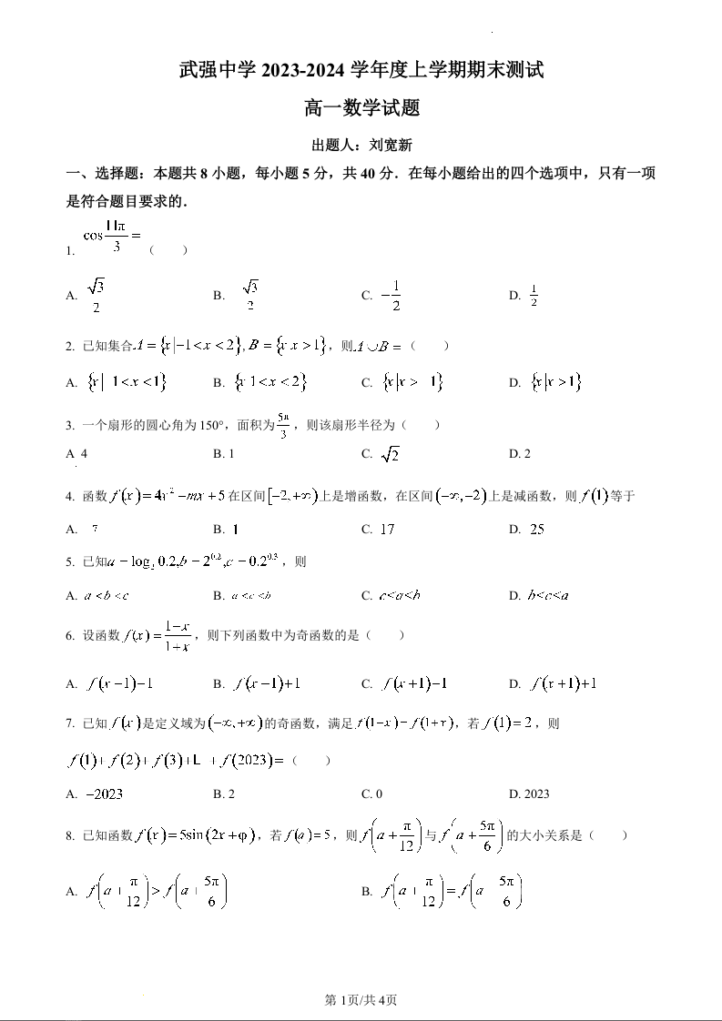河北省衡水市武强中学2023-2024学年高一上学期期末考试数学(原卷版)