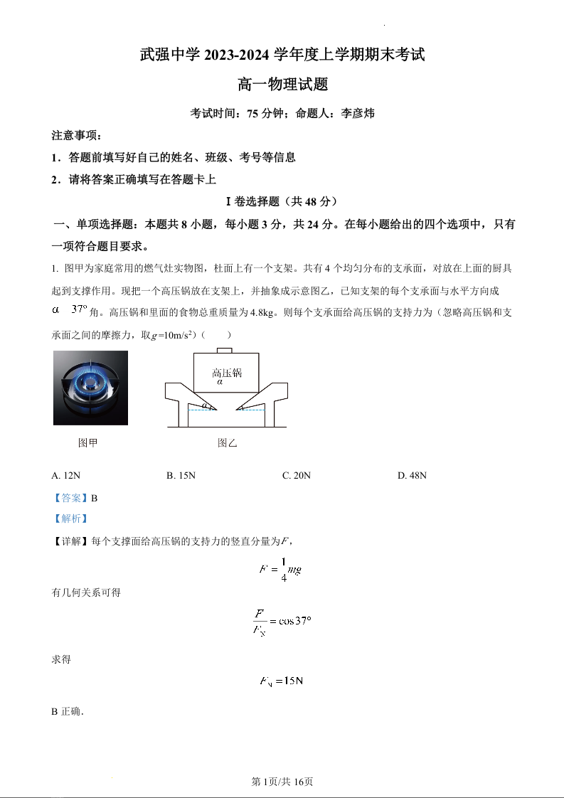 河北省衡水市武强中学2023-2024学年高一上学期期末考试物理(精品解析版)