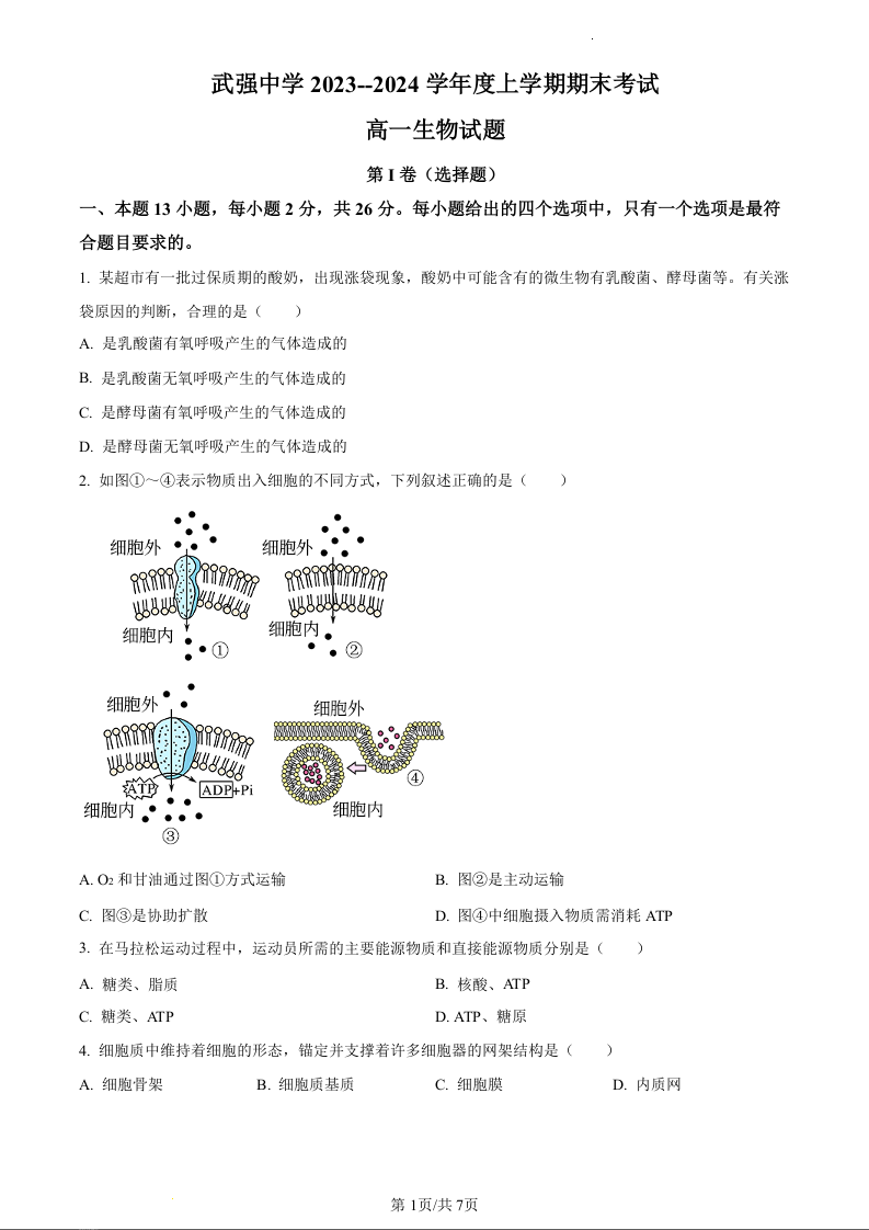 河北省衡水市武强中学2023-2024学年高一上学期期末考试生物(原卷版)