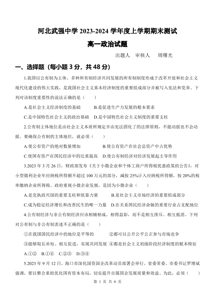 河北省衡水市武强中学2023-2024学年高一上学期期末考试政治