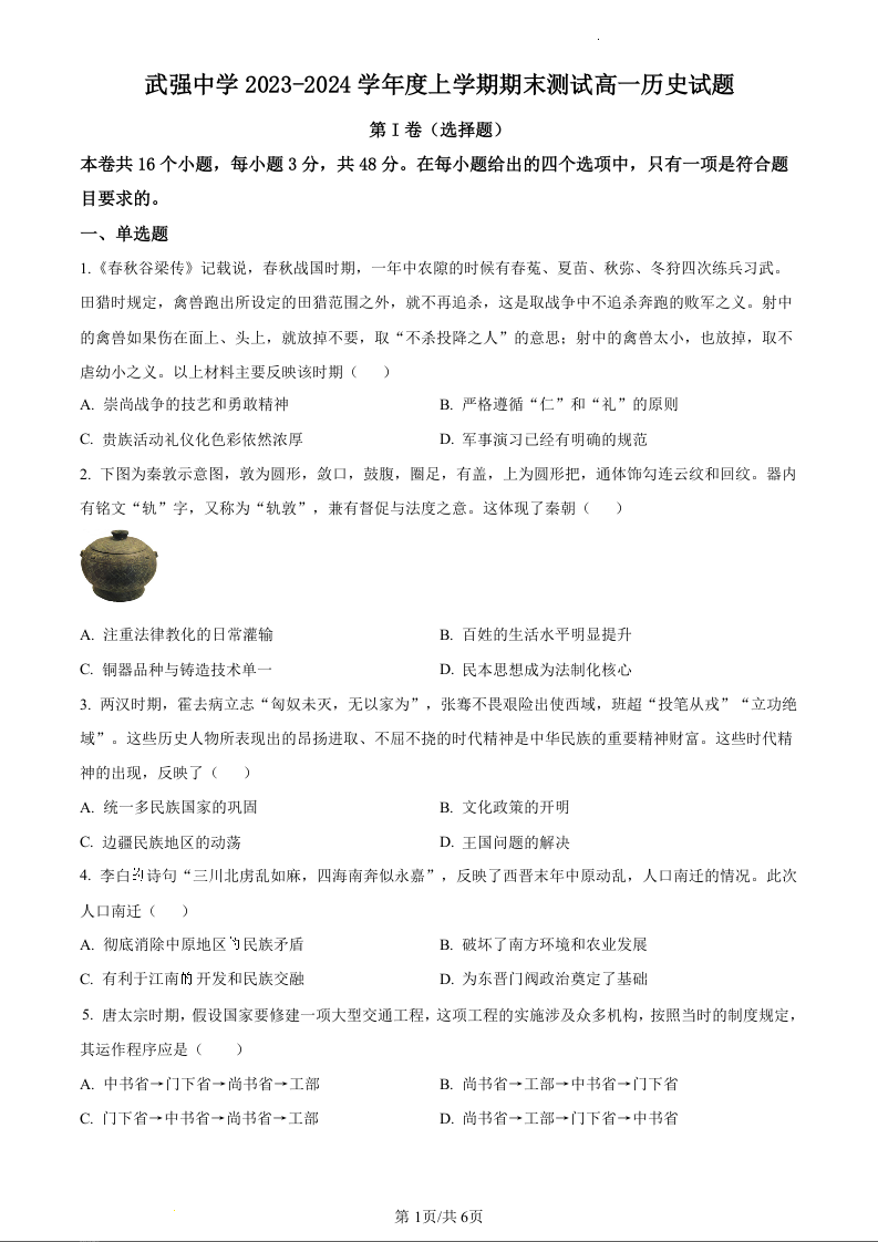 河北省衡水市武强中学2023-2024学年高一上学期期末考试历史(原卷版)