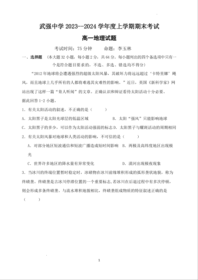 河北省衡水市武强中学2023-2024学年高一上学期期末考试地理