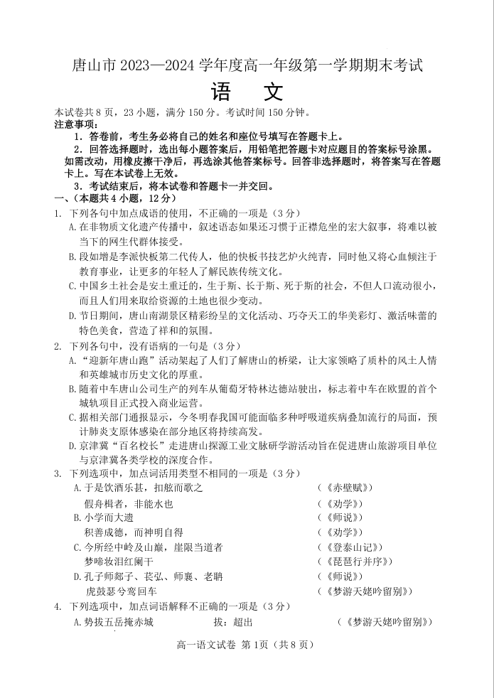 河北省唐山市2023-2024学年高一上学期1月期末测试语文+答案