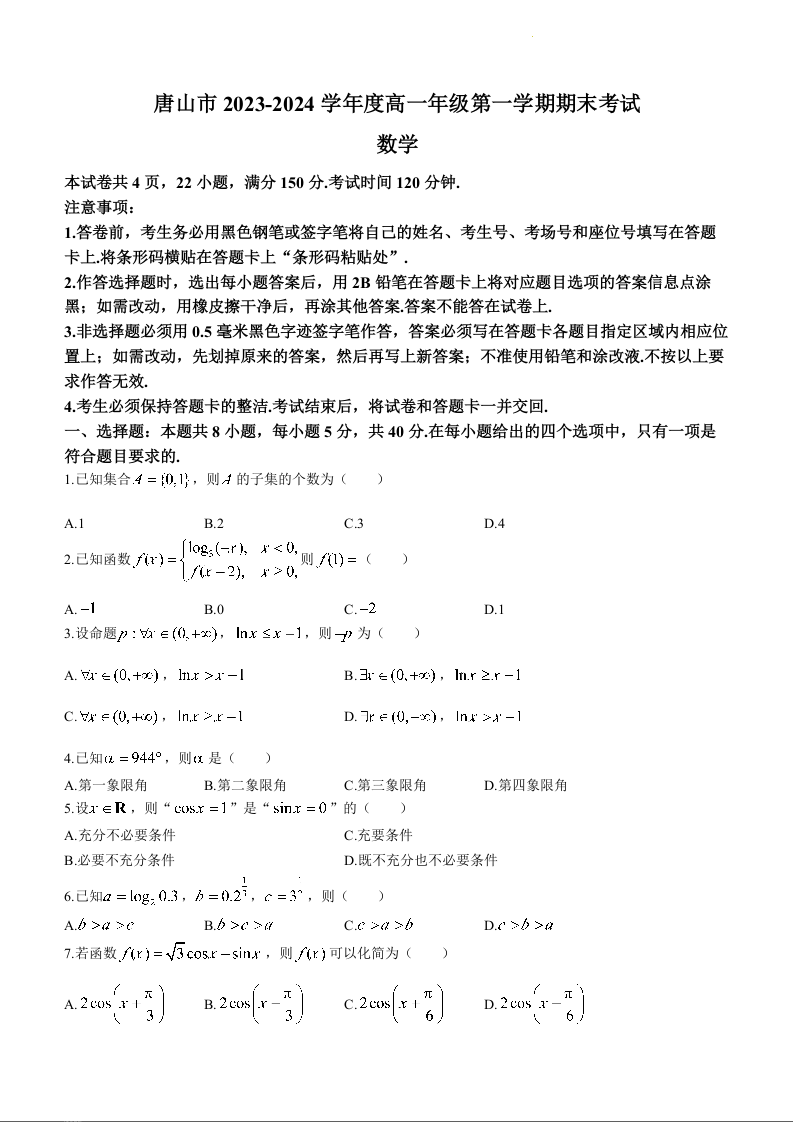 河北省唐山市2023-2024学年高一上学期1月期末测试数学