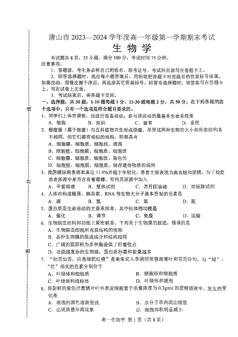 河北省唐山市2023-2024学年高一上学期1月期末测试生物