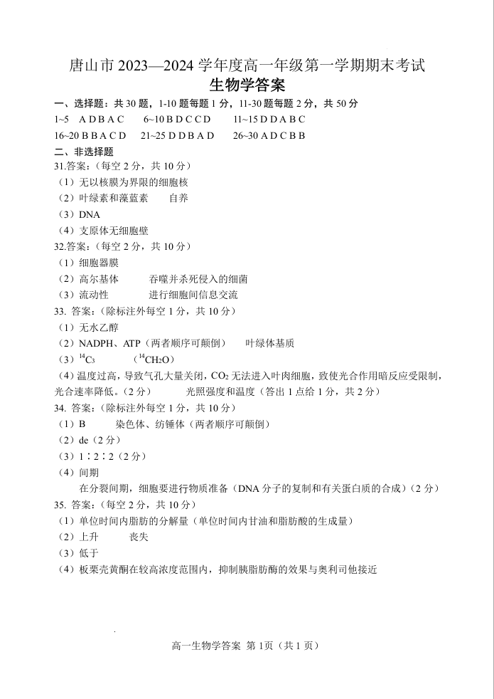 河北省唐山市2023-2024学年高一上学期1月期末测试生物答案