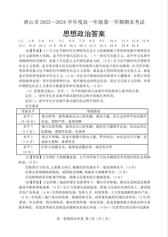 河北省唐山市2023-2024学年高一上学期1月期末测试政治答案