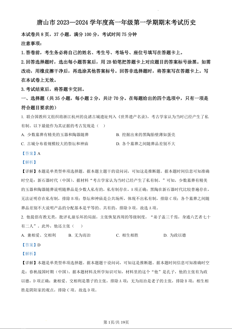 河北省唐山市2023-2024学年高一上学期1月期末测试历史(精品解析版)