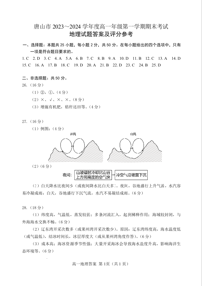 河北省唐山市2023-2024学年高一上学期1月期末测试地理答案