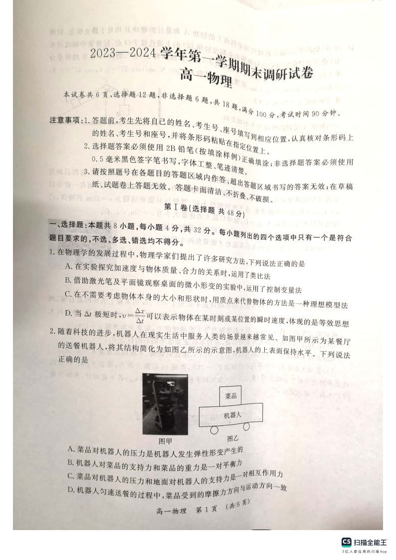 河南省开封市2023-2024学年高一上学期期末考试物理