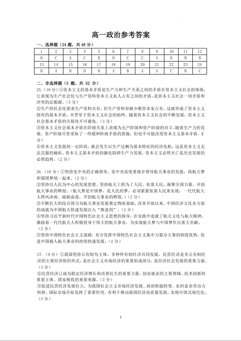 河南省开封市2023-2024学年高一上学期期末考试政治答案