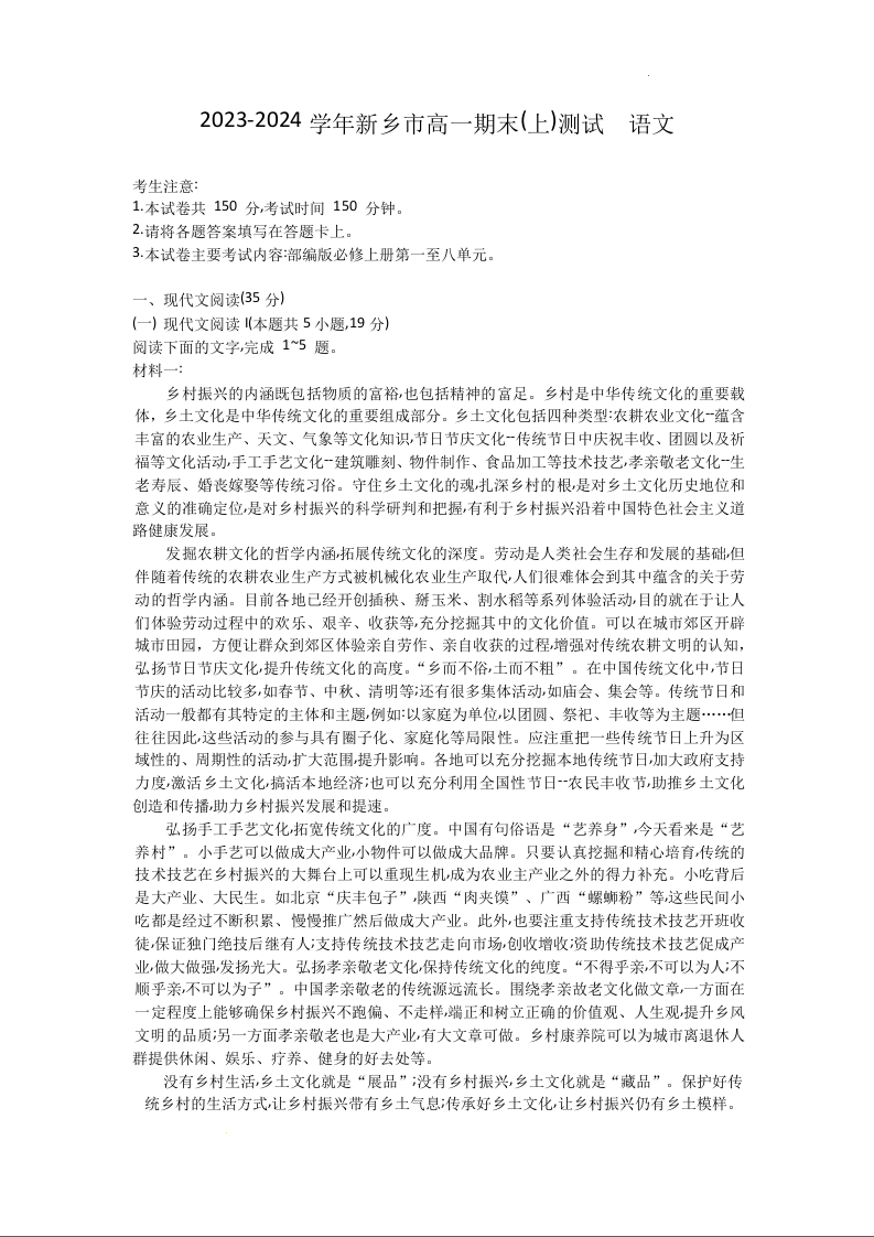 河南省新乡市2023-2024学年高一上学期期末测试语文