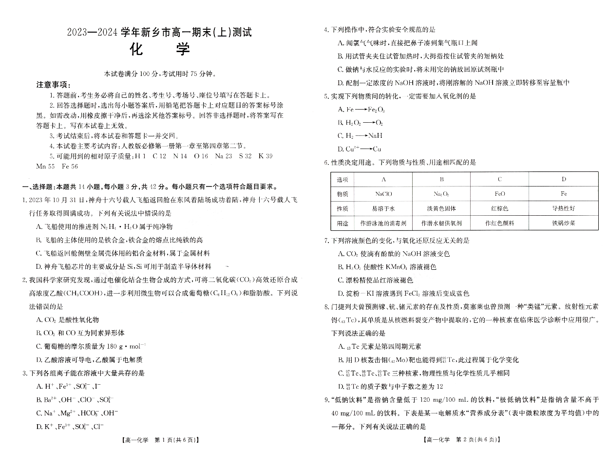 河南省新乡市2023-2024学年高一上学期期末测试化学