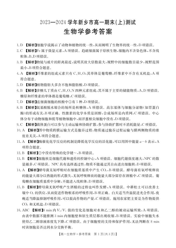 河南省新乡市2023-2024学年高一上学期期末测试生物答案