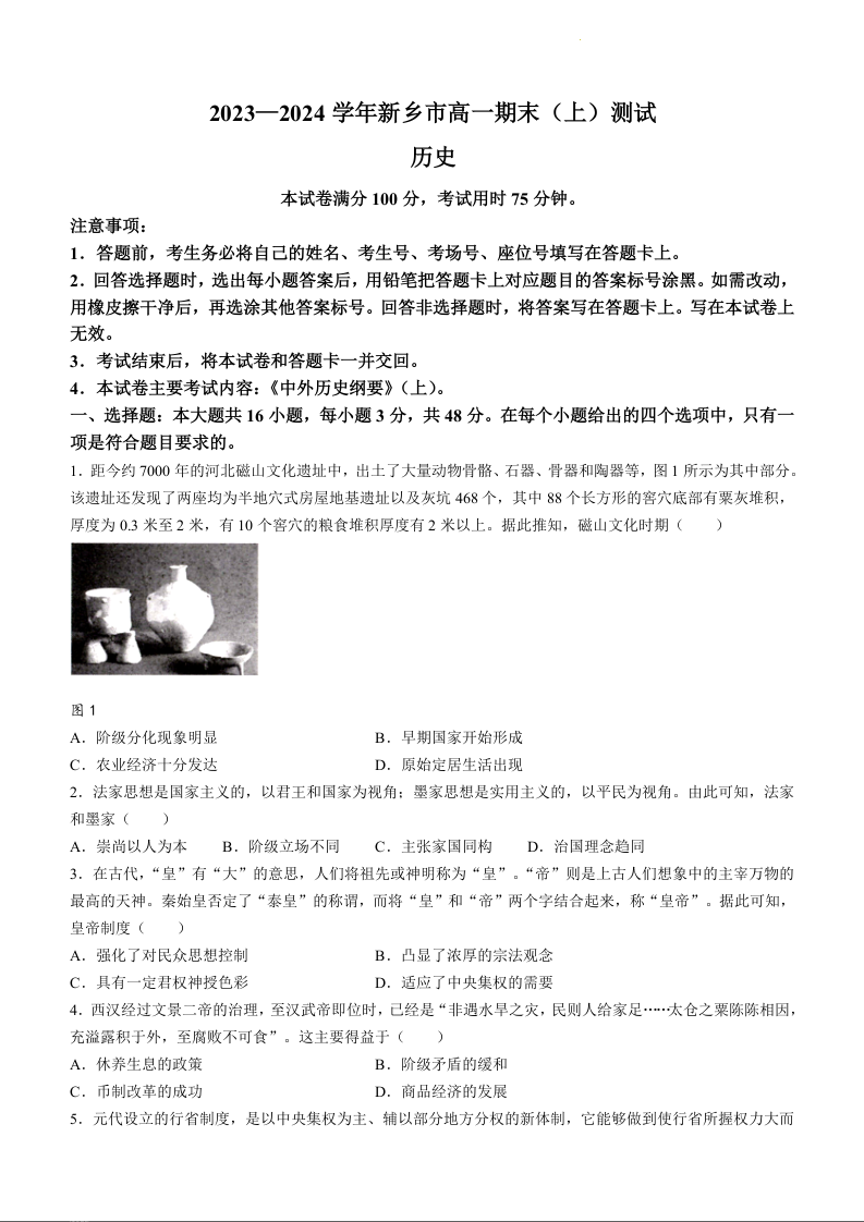 河南省新乡市2023-2024学年高一上学期期末测试历史