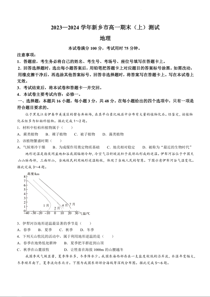 河南省新乡市2023-2024学年高一上学期期末测试地理
