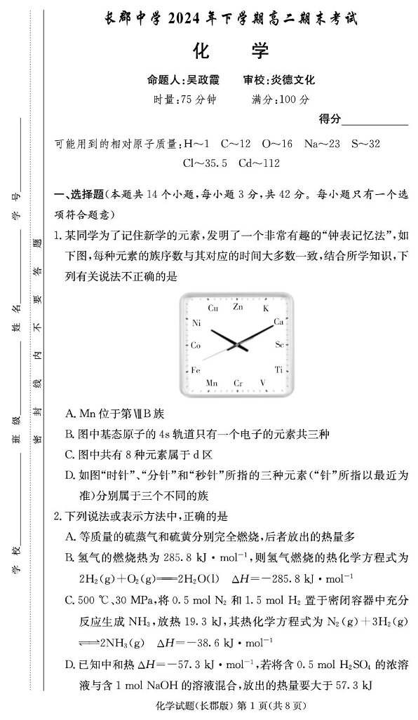 湖南省长沙市长郡中学2024-2025学年上学期高二期末考试化学+答案