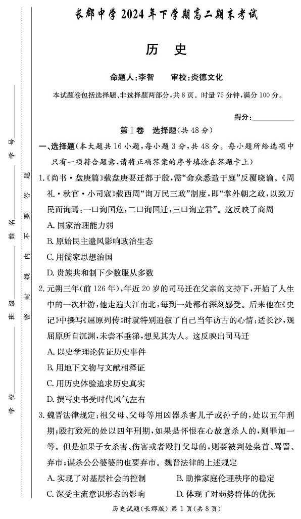 湖南省长沙市长郡中学2024-2025学年上学期高二期末考试历史+答案