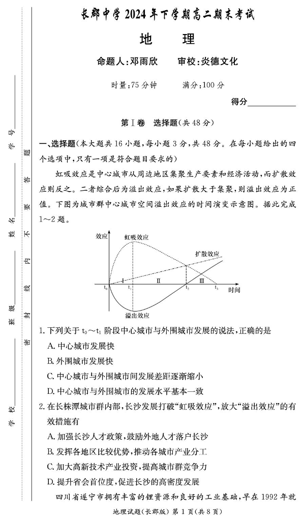 湖南省长沙市长郡中学2024-2025学年上学期高二期末考试地理+答案